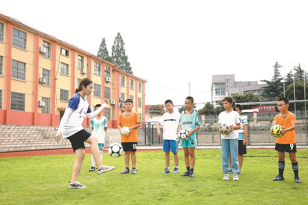 7月21日,铜陵市义安区新桥小学的学生们正在志愿者的带领下学习足球知识。连日来,安徽师范大学15名大学生志愿者在新桥小学开展暑期社会实践活动,丰富孩子们的暑期生活。 本报记者 杨竹 本报通讯员 梅建广 摄