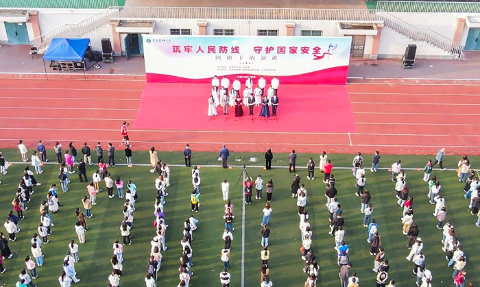 4月22日清晨,筑牢人民防线 守卫国家安全——“国旗下的演讲”主题教育活动在我校梅山路校区体育场举行。