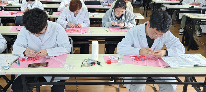 随着比赛正式开始,四十名参赛选手迅速投入战斗。他们手持工具,在小小的蜡块上专注雕琢,眼神中满是认真与执着。运刀时,他们仿若被赋予神技,从牙齿整体形态的勾勒,到窝沟点隙的精细刻画,每一个动作都饱含对专业的敬畏。在他们的巧手下,一颗颗栩栩如生的牙齿逐渐成型,仿佛被赋予了生命的灵动。现场氛围紧张而热烈,只听见刀具与蜡块接触时的细微声响,所有人都沉浸在这场匠心独运的技艺创作之中。