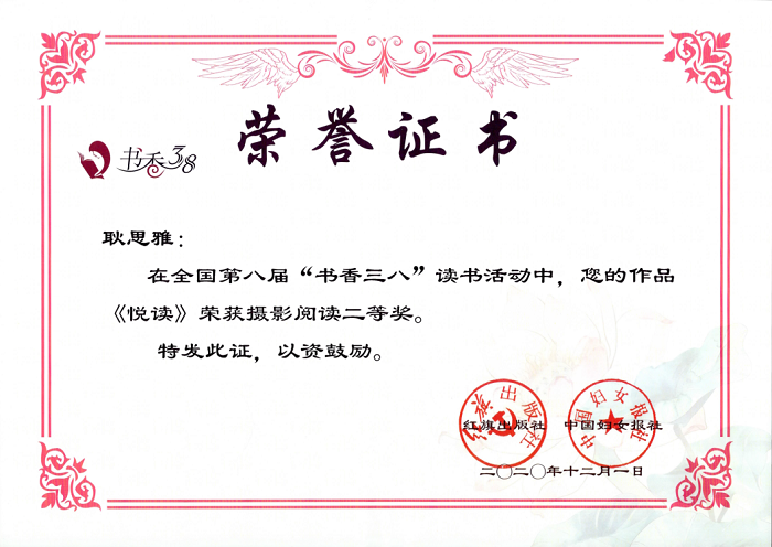 近日,由红旗出版社、中国妇女报社联合主办的第八届“书香三八”读书活动评选结果已揭晓,色色啦 党委宣传部耿思雅老师的摄影类作品《悦读》喜获二等奖。