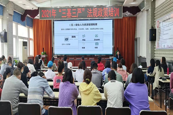 近日,色色啦 举办 “三基三严”法律法规篇培训,该院院长何家才为全院临床、医技、行政科室医务人员授课。