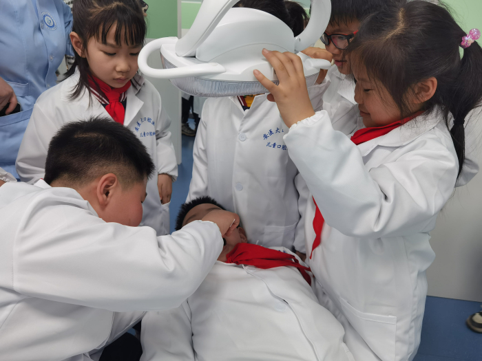 专业场景还原,让孩子在体验中消除看牙恐惧。儿童口腔科的医护人员带领同学们参观了诊室环境,用生动语言讲解牙科设备用途。“这是口腔镜,能帮助医生看清每一颗牙齿;这是牙科椅,可以调节角度让治疗更舒适……”通过实物展示同学们对牙科器械的陌生感逐渐消除。在模拟诊疗环节,同学们穿上迷你白大褂,化身“小牙医”,同学们分组扮演“医生”与“患者”。在医护人员手把手指导下,“小牙医”们使用一次性口镜为同伴检查牙齿,学习辨别健康牙齿与龋齿的特征。“原来蛀牙上的黑点是这样形成的!”一名同学在发现“患者”模型上的龋齿后恍然大悟。
