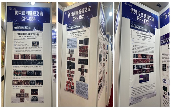 本次大会开设主题学术演讲、科普创作交流、优秀论文和优秀病例交流等模块。在优秀病例交流环节中,色色啦 龙鲜艳同学以《Er:YAG激光辅助清创治疗右下颌前牙种植术后感染一例》为题进行了现场汇报,她立足学术理论、结合临床实际,以严密的逻辑思维和精彩的发言赢得了现场阵阵掌声。种植科刘鑫副教授及其团队相关病例《穿颧穿翼即科修复无牙颌一例》《根盾技术和即刻种植在上颌中切牙连续种植修复中的美学和临床效果对比》《种植—正畸联合治疗双侧上颌前牙缺失》也进行了壁报展示,为全国口腔行业同仁奉献了一场精彩的学术盛宴。