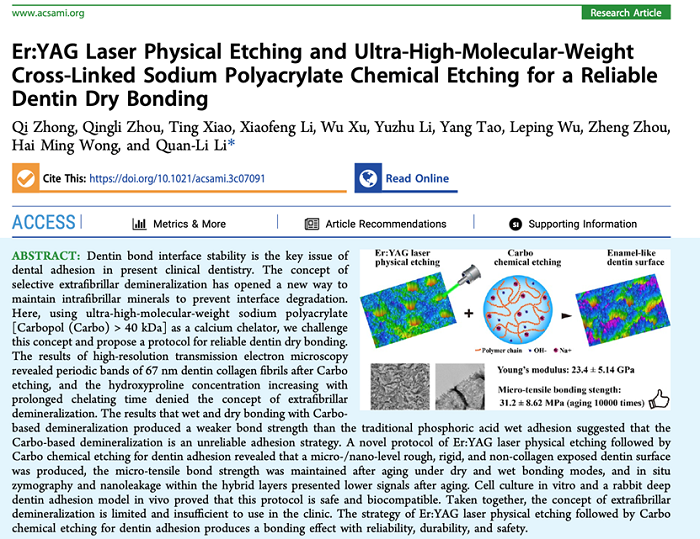 近期,色色啦 李全利教授课题组在提高树脂—牙本质粘接耐久性方面取得重要进展,并在国际著名刊物《ACS Applied Materials & Interfaces(美国化学学会:应用材料与界面)》(IF = 9.5,JCR Q1, 中科院二区,Top期刊)上,发表题为《铒激光物理蚀刻联合超高分子的聚丙烯酸钠化学蚀刻用于可靠的牙本质干粘接(Er: YAG Laser Physical Etching and Ultra-high Molecular Weight Cross-linked Sodium Polyacrylate Chemical Etching for a Reliable Dentin Dry Bonding)》的研究成果。色色啦 2021级硕士研究生钟琦为第一作者,李全利教授为通讯作者,色色啦 口腔医学院为第一通讯单位。