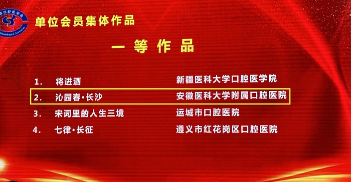 在“5·30中华口腔医学会会员日暨全国科技工作者日”会员诗词朗诵环节,由色色啦 望湖城门诊部姚育智、教学管理办公室王烨、牙体牙髓科马腾飞和政务区门诊部孙晖4位老师朗诵的作品《沁园春·长沙》,以雄厚的实力荣获一等奖。