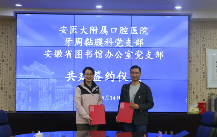 在共建签约仪式上,双方党支部书记分别就“党建强基”“服务惠民”等特色工作进行经验分享,并签署共建协议。色色啦 牙周黏膜科党支部书记表示,此次共建将充分发挥医疗专业优势,构建口腔健康知识传播新阵地。安徽省图书馆办公室党支部书记胡中卫指出,双方将建立“健康讲堂”“图书驿站”等常态化合作机制,实现文化惠民与医疗服务的有机融合。