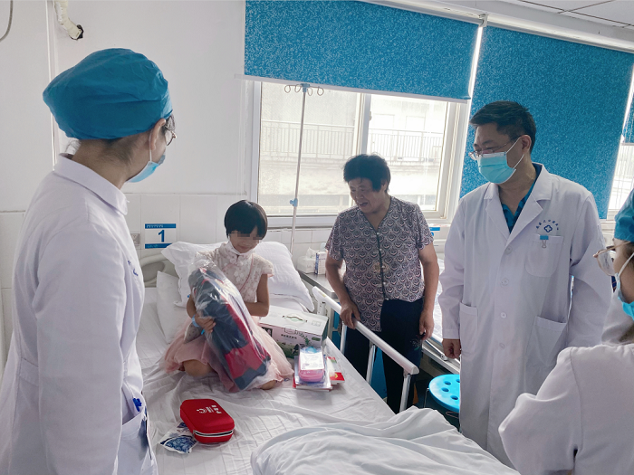 8月23日上午,颌面外科支部书记王银龙带领支部成员看望慰问了该患儿。王银龙与患儿家属亲切交谈,送去温暖的问候,询问患儿病情恢复及学习情况,代表支部向患儿赠送了书本、文具书包及牛奶等物品,并鼓励患儿积极配合治疗,健康快乐成长。