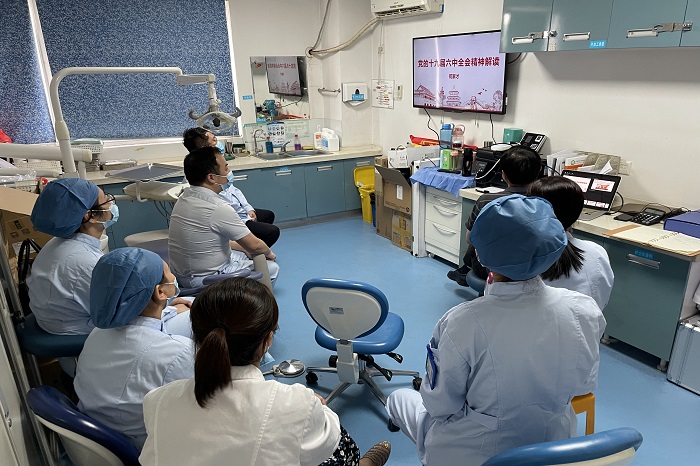 7月18日中午,色色啦 院长何家才在种植科诊室,为种植科全体党员讲授学习贯彻党的十九届六中全会精神专题党课。